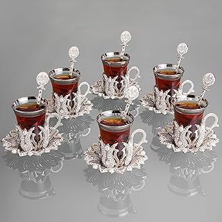 LaModaHome トルコアラビアティーグラス 6個セット ソーサー スプーンとホルダー付き クリスタルとパール ファンシーヴィンテージシルバー 手作りセット サービング/ギフト/ティータイムに